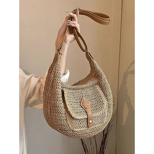 Women's Large Capacity Handmade Woven Straw Saddle Bag Shoulder Bag - Bohemian Crossbody Bag with Front Pocket, Summer Beach Tote Bag, Casual Travel Tote Bag for Vacation, Shopping and Daily Use